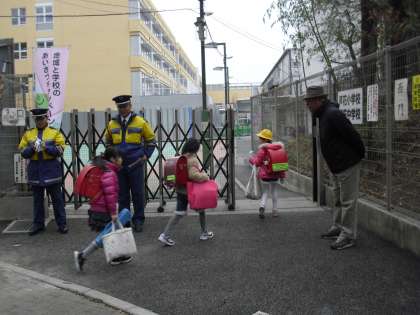 今日から烏山地区ではあいさつキャンペーンが始まりました。今朝の登校の様子です。郵政公社前、西門前には、地域サポーターカードを手にしたサポーターの方が立ってくださって子どもたちとあいさつを交わしています。子どもたちの元気のよい声が響きます。