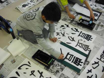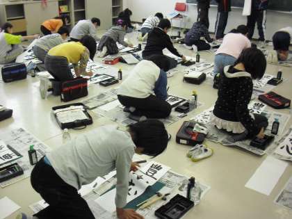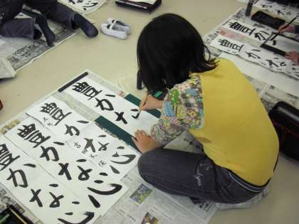 5年生の書写、書き初めの授業の様子です。多目的室で行っています。課題文字は「豊かな心」です。字形や文字の大きさに注意して書きます。お手本をよく見ながら一画一画丁寧に書いています。文字通り「豊かな心」をはぐくみ最高学年に向けてがんばっている5年生です。