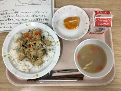今日は、親子丼、さといものみそ汁、ゆめオレンジ、牛乳です。