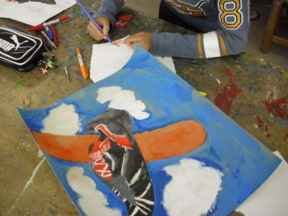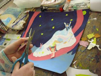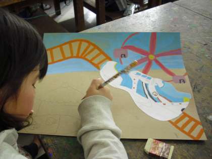 4年生の図画工作の授業の様子です。「運動靴から広がる世界」の制作に取り組んでいるところです。靴に乗って宇宙に行ったり、靴がレールの上を走ったり等、自分の靴から様々な世界へ夢は広がっていきます。