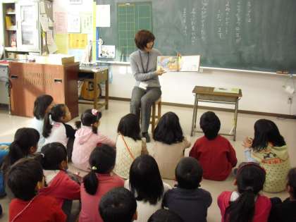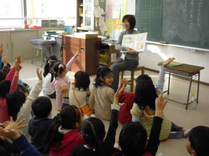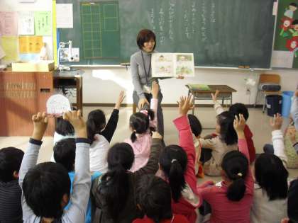 今週も前回とは違う1年生のクラスに、渡部校長が読み聞かせをしました。子どもたちも大喜びです。子どもたちと会話をしながら進めるお話では、「もしも家の外が、大雨だったら、雪だったら、ジャングルだったら、どれがいい?」と手を挙げる子どもたちに「どうして?」と理由を尋ねるなど、子どもたちも渡部校長もコミュニケーションを楽しんでいました。