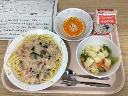 今日は、鮭とほうれん草のクリームスパゲティー、ポテト入りフレンチサラダ、早香、牛乳です。