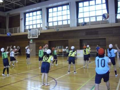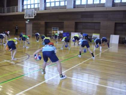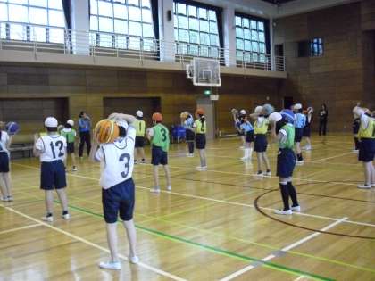 5年生の体育の授業の様子です。バスケットボールを行う前に、ボール操作を取り入れたコーディネーション運動を行っているところです。ボール操作と様々な動きを組み合わせて、バランス感覚や反応力を養う運動です。状況に応じた動きを必要とするバスケットボールにつながる運動です。