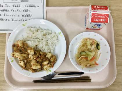 今日は、冬のマーボー丼、春雨サラダ、牛乳です。