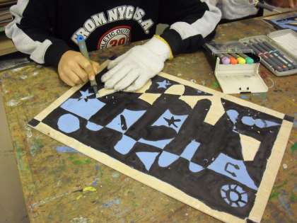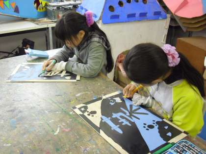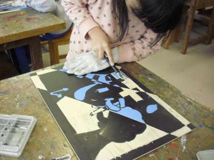 5年生の図画工作の授業の様子です。版画「一文字から広がる世界」の制作に取り組んでいるところです。自分の名前の一文字を中心にデザインを工夫します。ずいぶんと彫り進んできました。印刷したイメージを考えながら作っていきます。