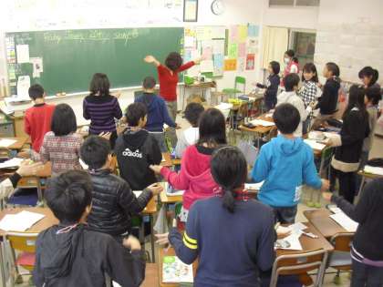 6年生の外国語活動の授業の様子です。担任と英語活動支援員のTTですす進めています。リズミカルな英語の歌を歌いながら手拍子を打ったり、ステップを踏んだりしながら身体表現を取り入れています。表現することを楽しめることは素晴らしいことです。