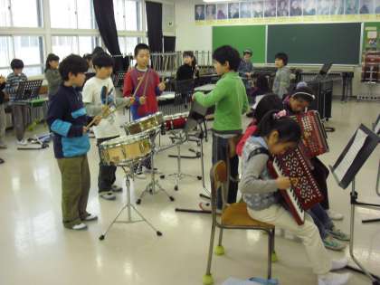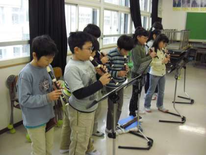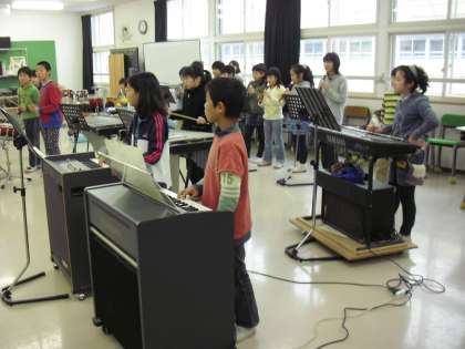 4年生の音楽の授業の様子です。「I Will Follow Him」という曲の合奏に取り組んでいるところです。パートの練習と全体で合わせる練習をくり返しながら曲の完成度を高めていきます。友達と互いに聴き合いながらリズムや音の長さを確かめるなど、曲と真剣に向き合っていました。