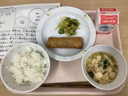 今日は、ごはん、春巻き、野菜の中華風味、かきたま汁、牛乳です。