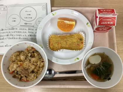 今日は、キムチチャーハン、切り干し大根の卵焼き、トックスープ、ゆめオレンジ、牛乳です。