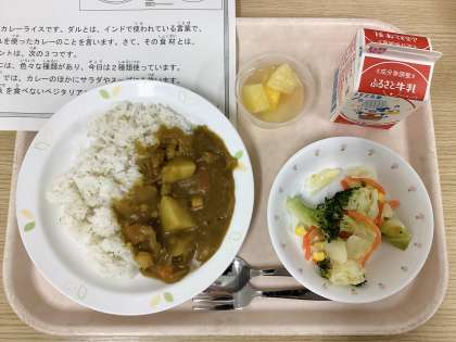 今日は、ダルカレーライス、ブロッコリーのサラダ、フルーツゼリー、牛乳です。