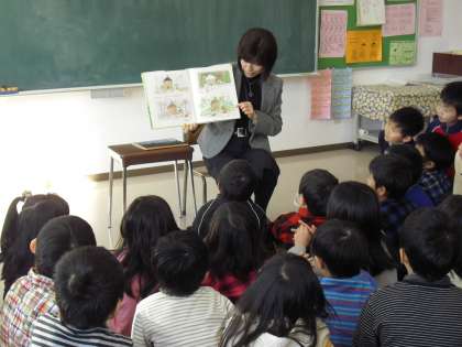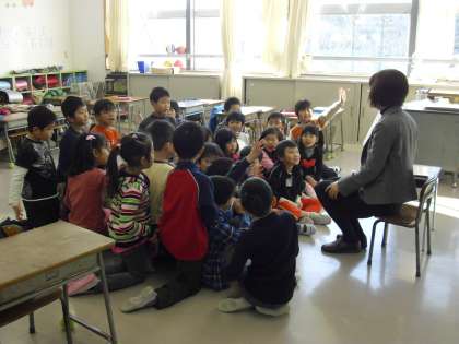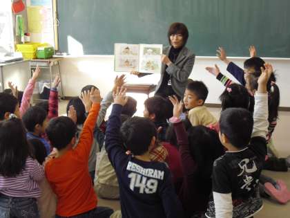 渡部校長が1年生に読み聞かせをしているところです。1年生もとても楽しみにしていました。「ねえ、どれがいい?」と渡部校長が投げかける問いに、子どもたちは元気よく手を挙げて答えていました。1年間での成長を感じます。