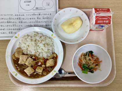 今日は、四川豆腐丼、ナムル、りんご、牛乳です。