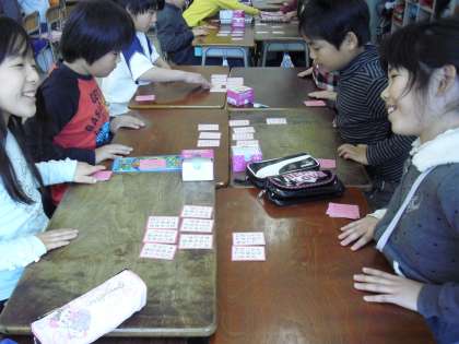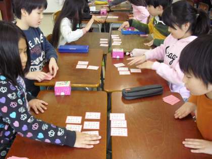 3年生の教科「日本語」の授業の様子です。二人一組になって百人一首大会を行っているところです。担任が上の句を読み上げると、句を覚えている子の反応は早かったです。楽しみながら、日本の伝統文化に親しんでいました。