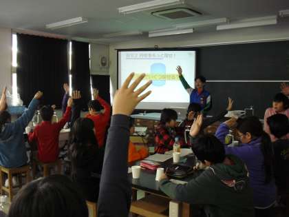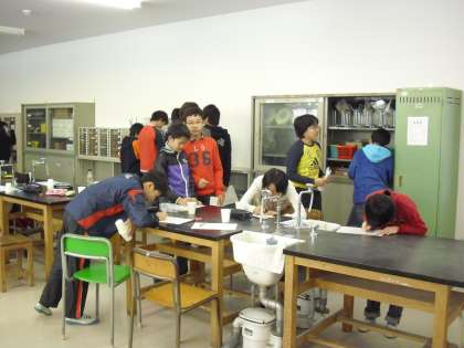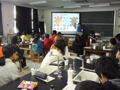 続いて「円柱」の科学です。はじめは机上で1分間、身近にある円柱状のものを考えワークシートに記入していきます。次は、理科室の中を自由に動き回って円柱状のものを探します。子どもたちは、どんどん円柱状のものを見つけていきました。動いて考えると新しい発見がたくさんあることに、子どもたちも自信をもったようです。