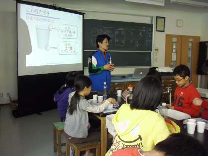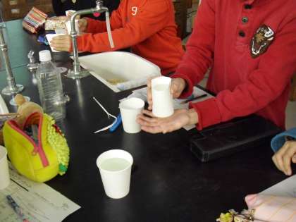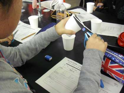 紙コップの科学です。紙コップには、飲み口にトップカールという部分と底は上げ底になっている部分があります。なぜ、そのような仕組みになっているのかを考えました。次に実際にトップカールの部分を切り取って、水を入れて持ち比べます。トップカールがないためにたいへん持ちにくくなりました。直接体験を通して科学のおもしろさを満喫した子どもたちでした。