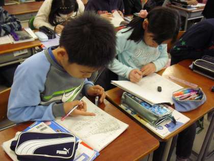 5年生の算数の授業の様子です。校内研究の研究授業として行いました。単元「割合とグラフ」の導入の授業です。バスケットボールのシュート成功率が課題です。8本シュートを打って5本成功したひろこさん、10本シュートを打って5本成功したけんたさん、10本シュートを打って6本成功したゆうこさんの3人のうち、一番うまいと言えるのはだれかを考えます。まずは、自力解決です。