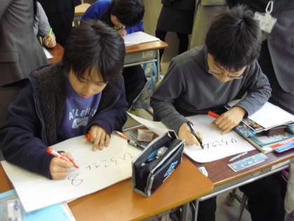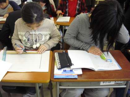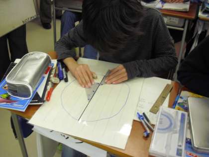 シュートをした数も成功した数も異なる場合、どのように比べたらよいのかを各自で考えているところです、計算をしたり、図に表したりしながら考えています。自分の考えを発表するために手作りのホワイトボードに大きく書きこんでいます。
