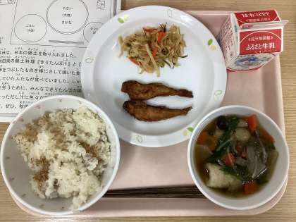 今日は、さといもごはん、ハタハタのカレー揚げ、はりはり漬、きりたんぽ汁、牛乳です。