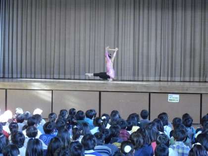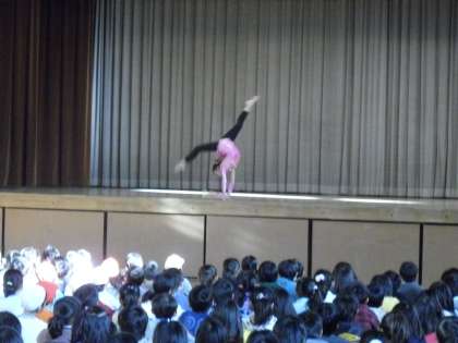 演技後は大きな拍手が沸き起こりました。渡部校長から、大会に臨むときの気持ちの持ち方や普段からの練習方法などについてインタビューを受け、はきはきと答えていました。将来は新体操の選手を目指しているそうです。がんばってほしいですね。