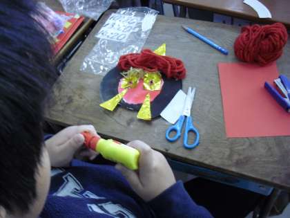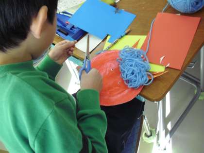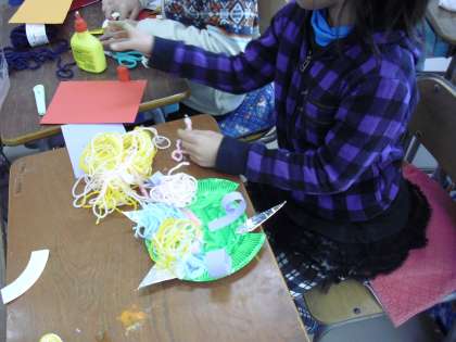 2年生の図画工作の授業の様子です。鬼のお面を作っているところです。顔の部分は紙皿を活用しています。毛糸でかみの毛を表現したり、色画用紙を使って角を作ってみたりと工夫が楽しい鬼のお面です。2年生も様々な表現方法を活用できるようになりました。