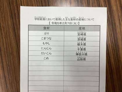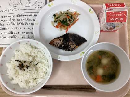 今日は、ごはん、ひじきとわかめのふりかけ、ぶりの南部焼き、カリカリ油揚げと野菜のからし醤油和え、ゆきのつゆ、牛乳です。