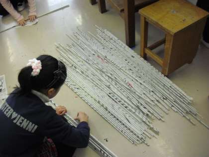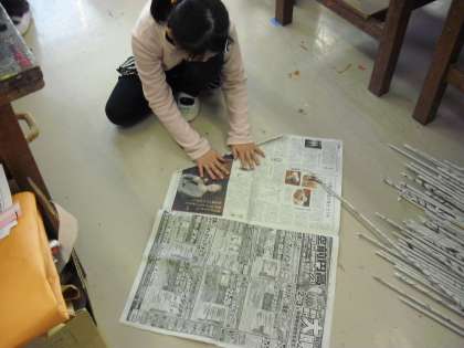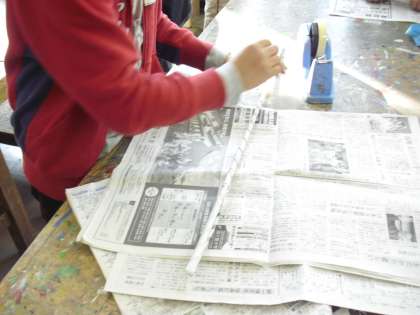 4年生の図画工作の授業の様子です。新聞紙の隠れ家作りの準備をしているところです。新聞紙を細く丸めて丈夫な円柱を作っています。隠れ家の骨格になる材料で、たくさん必要です。グループで協力して作業を進めていました。