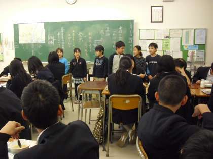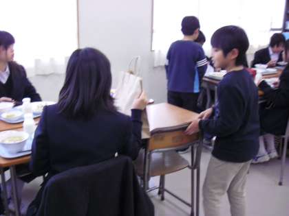 下校前、3年生が中学2年生の教室に向かいました。手には、午前中に作った蒸しパンの入った紙袋があります。教室に入って、コンフィチュール作りのお礼と、そのコンフィチュールを使って作った蒸しパンをお礼に食べてくださいと、ちょっと緊張したような表情で伝えました。そしていっしょに作った中学生に蒸しパンの入った袋を手渡しました。手渡すと笑顔になります。中学生から温かい拍手をもらいました。心もほっこりです。
