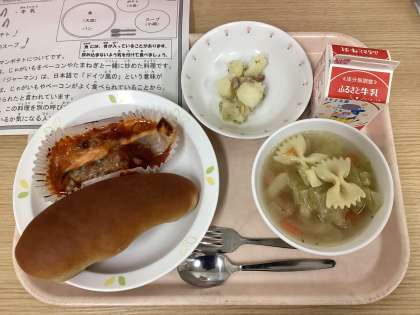 今日は、黒砂糖パン、魚のピザ風、ジャーマンポテト、パスタと野菜のスープ、牛乳です。