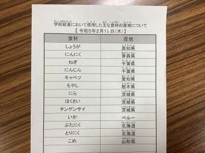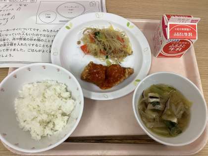 今日は、ごはん、イカのチリソース、チャーホーサイ、中華スープです。