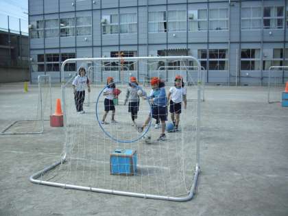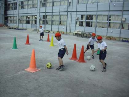 1年生の体育の授業の様子です。ボール蹴り遊びゲーム「キックランド」の学習をしているところです。ボールを足で操作しながら、ドリブルでコーンの間を走り抜けたり、渦巻状にドリブルしたり、ゴールにシュートしたりといろいろな場で運動を楽しんでいます。いろいろな動きが経験できる工夫です。