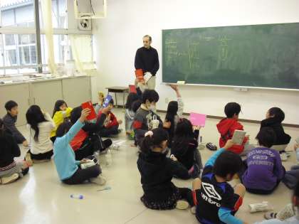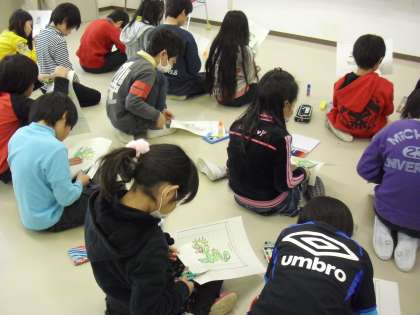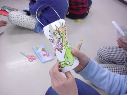3年生の英語活動の様子です。今日のテーマは道具。ハサミとのりと色鉛筆を持って多目的室に行きました。ALTの先生から龍を描いた画用紙を配られ、線に沿って切り取り、のりで接着しながらランタンを作りました。使った道具を「Scissors」「Color pencil」等と確認しました。