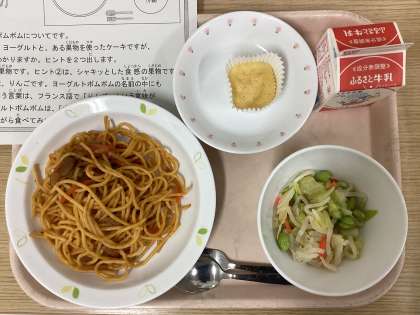 今日は、スパゲティーナポリタン、枝豆サラダ、ヨーグルトポムポム、牛乳です。
