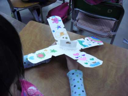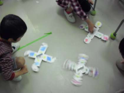 2年生の国語の授業の様子です。説明文の単元「紙パックでコマをつくろう」の学習をしているところです。説明文に沿って作った紙パックのコマを実際に回しているところです。回すときれいな模様がうかび上がります。どの子もきれいに描かれていました。