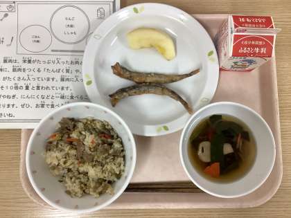 今日は、豚肉とごぼうのごはん、ししゃもの唐揚げ、お麩とほうれん草のすまし汁、りんご、牛乳です。