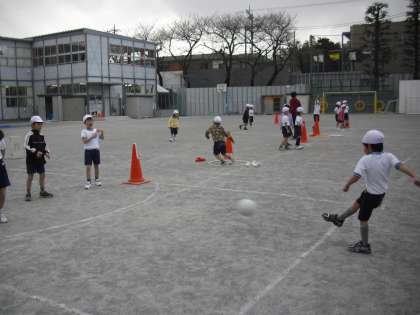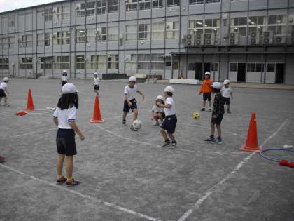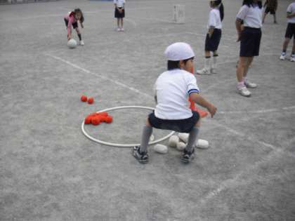 1年生の体育の授業の様子です。ボール蹴り遊びをしているところです。ボールを蹴って、コーンの間に立って守っている相手を抜いたら得点です。得点したら自分で紅白玉をフラフープの中に入れます。得点への意欲も高まる工夫です。