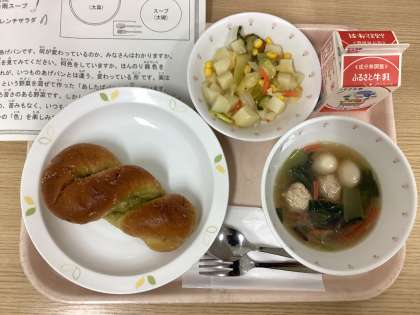 今日は、かわりあげパン、肉団子入り春雨スープ、ポテト入りフレンチサラダ、牛乳です。