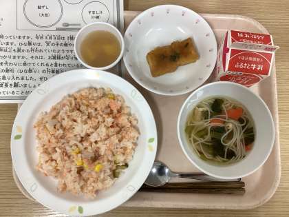 今日は、鮭ずし、生揚げおろしあん、そうめん入りすまし汁、桃のゼリー、牛乳です。