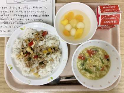 今日は、ガパオライス、コーンと卵のスープ、白玉ポンチ、牛乳です。