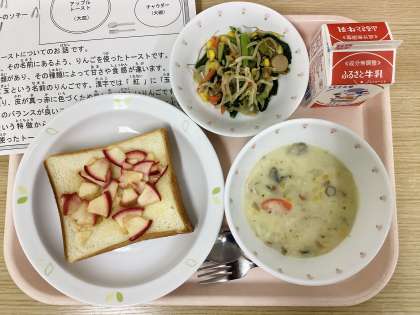 今日は、アップルトースト、小松菜とウインナーのソテー、森のチャウダー、牛乳です。