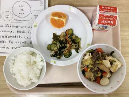 今日は、ごはん、すき焼き煮、カリじゃこサラダ、せとか、牛乳です。