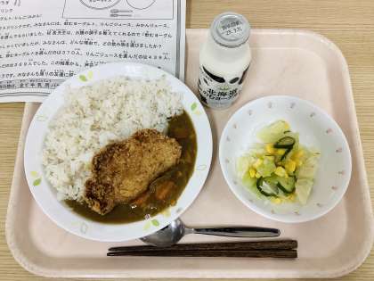 今日は、カレーライス、とんかつ、フレンチサラダ、セレクトドリンク(飲むヨーグルト、りんごジュース、みかんジュース)です。