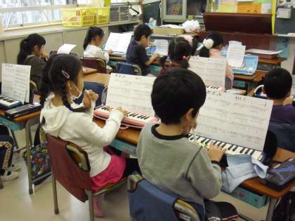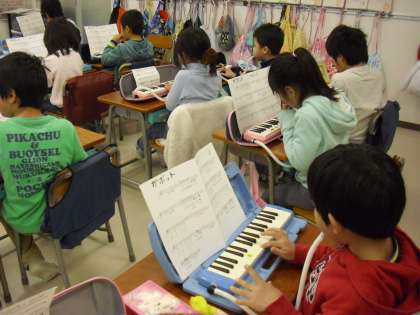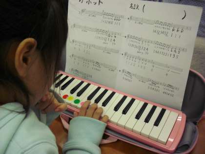 1年生の音楽の授業の様子です。6年生を送る会で演奏する曲を鍵盤ハーモニカで練習しているところです。楽譜には、指の番号を書きこんで正しい指づかいで演奏できるようにしています。何度も何度もくり返し練習しています。いろいろなことができるようになった1年生です。