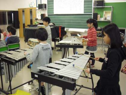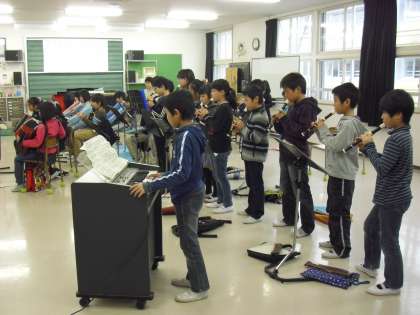 4年生の音楽の授業の様子です。来週にせまってきた2分の1成人式に向けて「I Will Follow Him」の演奏に取り組んでいるところです。音を重ねるタイミングを合わせるために部分的にくり返して練習していくと、息も合ってきました。子どもたちの気持ちもそろってきました。