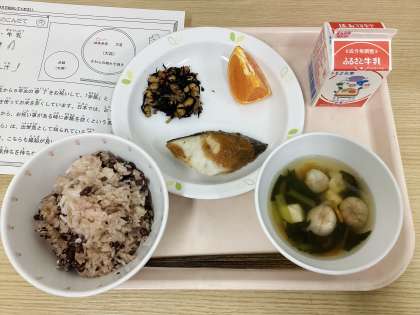 今日は、赤飯、さわらの梅みそ焼き、大豆の磯煮、お麩と小松菜のすまし汁、牛乳です。