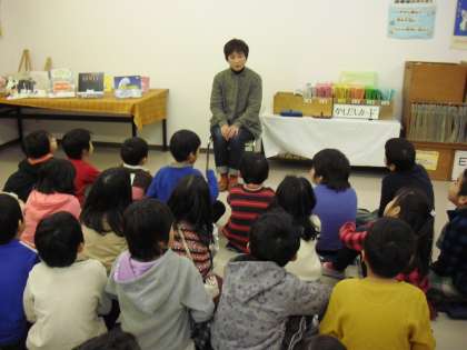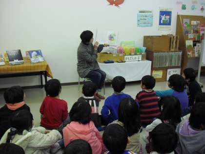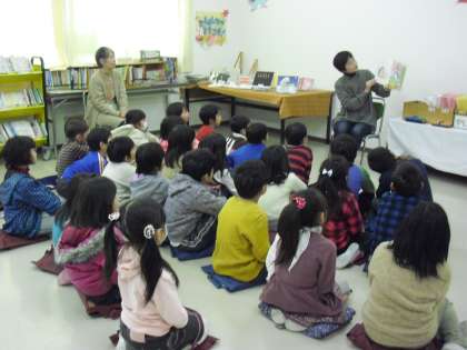 1年生のお話会の様子です。全日本語りネットワークの方々による読み聞かせ活動です。子どもたちの表情を見ながらの語り部。声色を変えたり、表情を変えたりしながら子どもたちをお話の世界に引き付けていきます。絵本を提示しての読み聞かせもあり、子どもたちの興味・関心を高めます。様々な読書活動の取り組みが豊かな情操をはぐくみます。