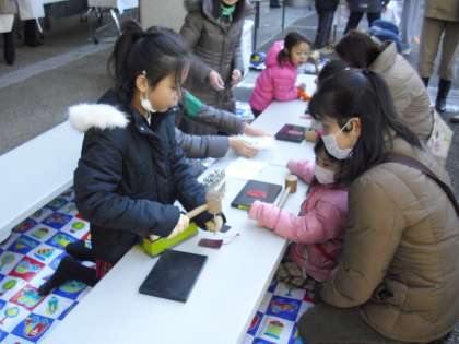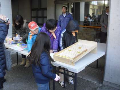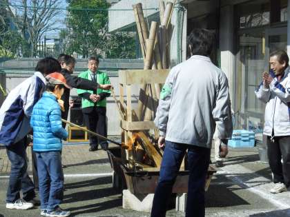 オープニングセレモニーの最後は「どんと焼き」です。点火には、芦花小の代表児童もいました。点火後におまつりのスタートです。芦花小の子どもたちも、パチンコやキーホルダー作りのお店を運営しています。