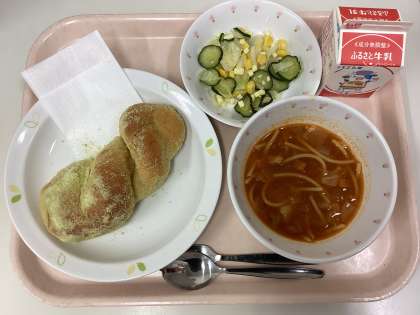 今日は、うぐいすあげパン、ミネストローネスープ、チーズ入りフレンチサラダ、牛乳です。