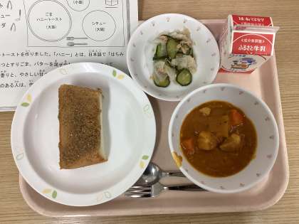 今日は、ごまハニートースト、ハンガリアンシチュー、大根とツナのサラダ、牛乳です。
