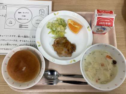 今日は、丸パン、鶏肉のバーベキューソース、ボイルキャベツ、クリームシチュー、清見タンゴール、牛乳です。