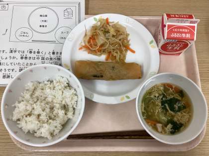今日は、麦ごはん、春巻き、辣白菜、卵とチンゲン菜のスープ、牛乳です。